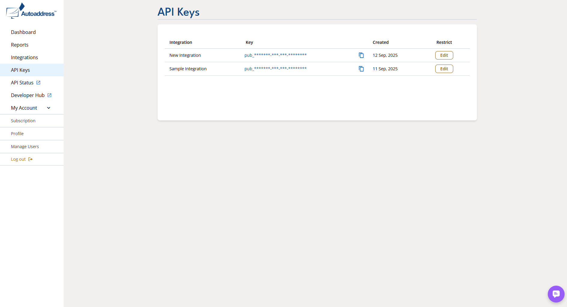 Alternatively, for quicker access, navigate to API Keys from the menu on the left and you will be able to see all your integration’s API keys.
