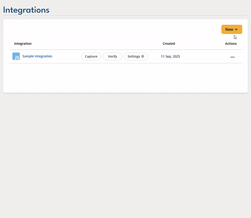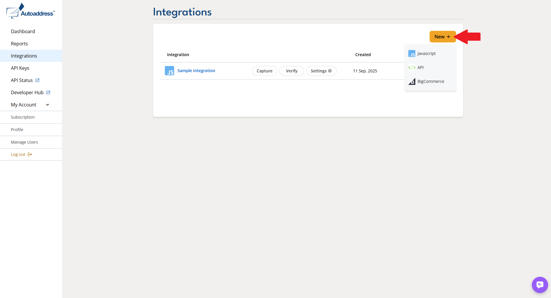 To start, navigate to Integrations from the menu and click the New + button. From here, select the integration type that is most relevant.