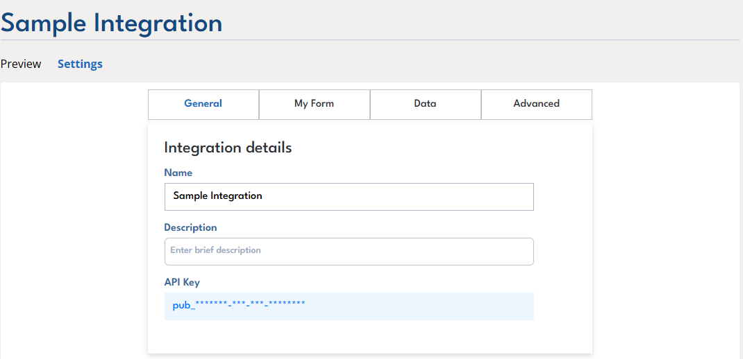 When creating any Integration, you will be able to access the API key associated with it. To do so, navigate to Settings and you will see they key under API Key.